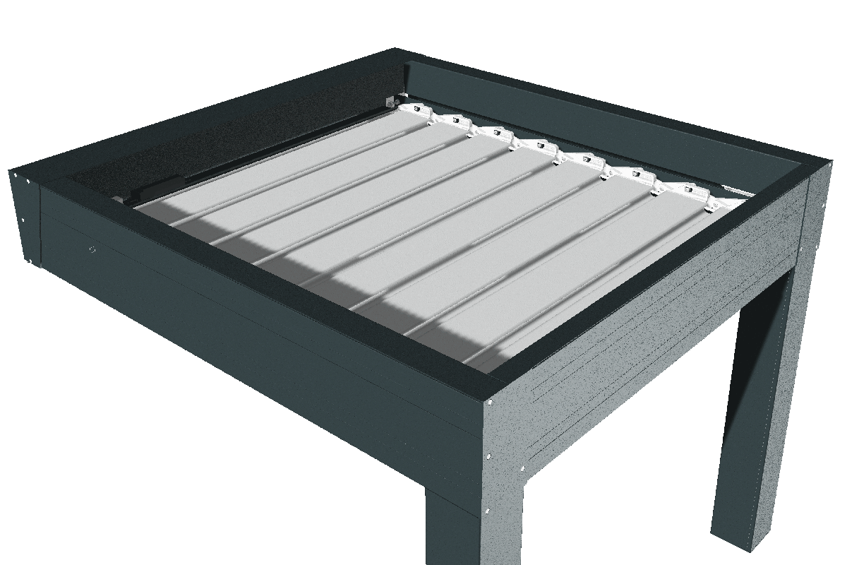 - Toit rétractable : les lames de la pergola s'orientent et se rétractent en même temps, formant un auvent protecteur lorsqu'elles sont repliées.